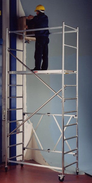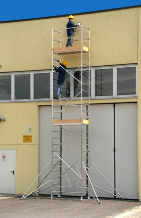 Trabattello professionale costituito da un modulo di base da m 1,96, moduli intermedi da m 1,50 e da una ringhiera di protezione da m 2,10, per un’altezza massima di lavoro (alla mano) di m 8,10.