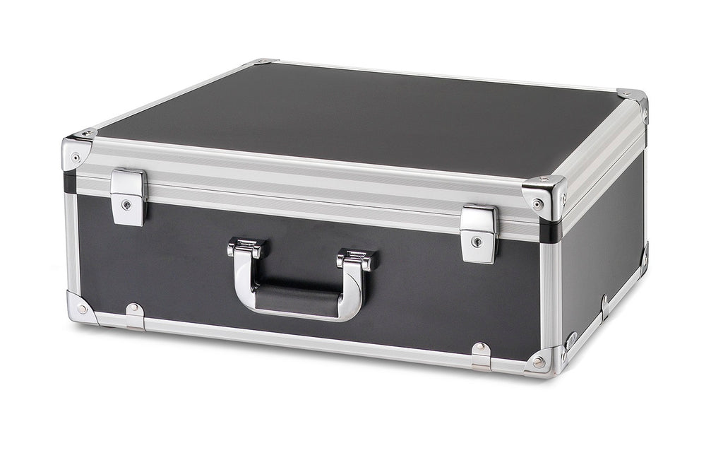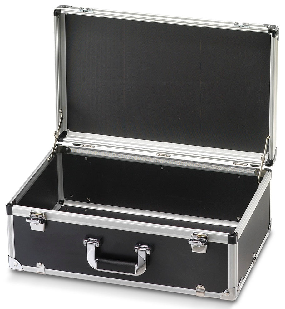 Valigia della linea HPL, robusta, capiente e leggera, in laminato di alta qualità colore nero con profilati estrusi in alluminio anodizzato.