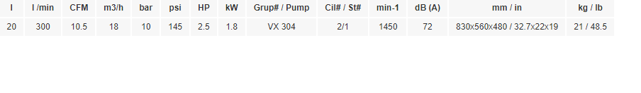 Gamma di compressori d'aria che racchiude diversi modelli destinati ad un utilizzo professionale. Gruppi compressore lubrificati ad olio di tipo coassiale con uno o due cilindri autoventilati grazie ad una ventola calettata direttamente sull'asse motore. Costruiti in conformità alle più severe normative internazionali sono in grado di soddisfare esigenze molto diverse tra loro ed essere impiegati da artigiani, imbianchini, falegnami, idraulici, muratori... Funzionano in maniera autonoma, tutti equipaggiati con riduttore di pressione, sono costruiti con forme differenti per settori di applicazione diversi. Motori elettrici in classe di isolamento F contruiti per un servizio continuo S1, IP 44, termicamente protetti con carcassa esterna di alluminio per dissipare più velocemente il calore. Cilindri in alluminio pressofuso con canna di acciaio riportata o cilindri in ghisa per alcuni modelli VX sono sinonimo di qualità e durata nel tempo.