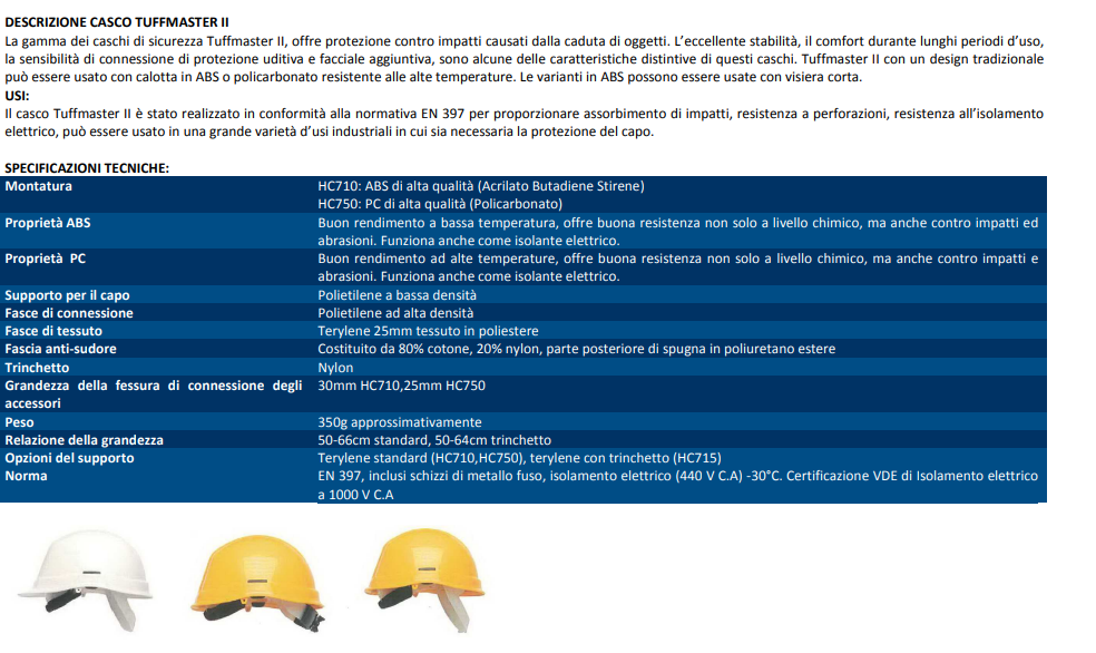 Casco tuffmaster II con calotta in ABS e supporto in terylene con 8 punti di fissaggio e fascia anti-sudore. Versione senza visiera. HC710/RP.