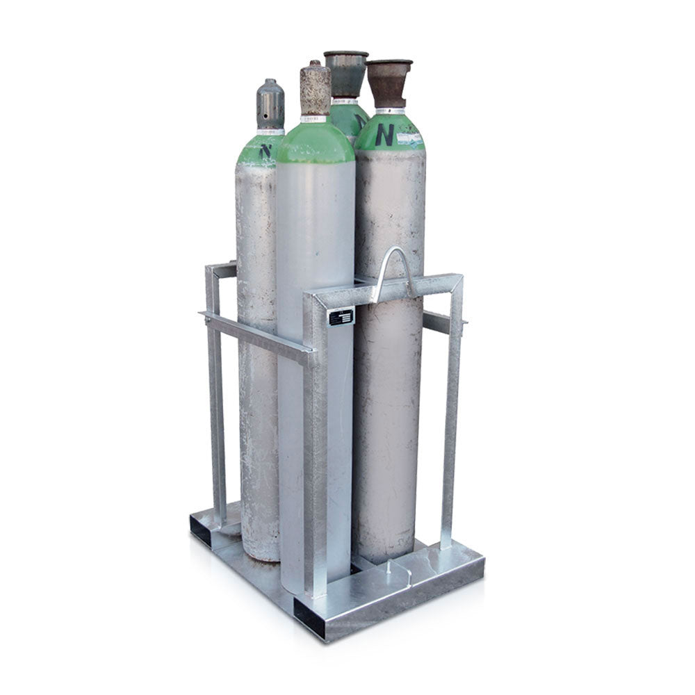 Contenitore per la movimentazione in sicurezza di 4 bombole diametro mm. 230. Portata kg.280. Conforme alla direttiva macchina 2006/42/CE, UNI EN 12100:2010, Allegato V del DLGS 81/08. Zincato. Dimensioni: mm. 860Lx650Px1115H .