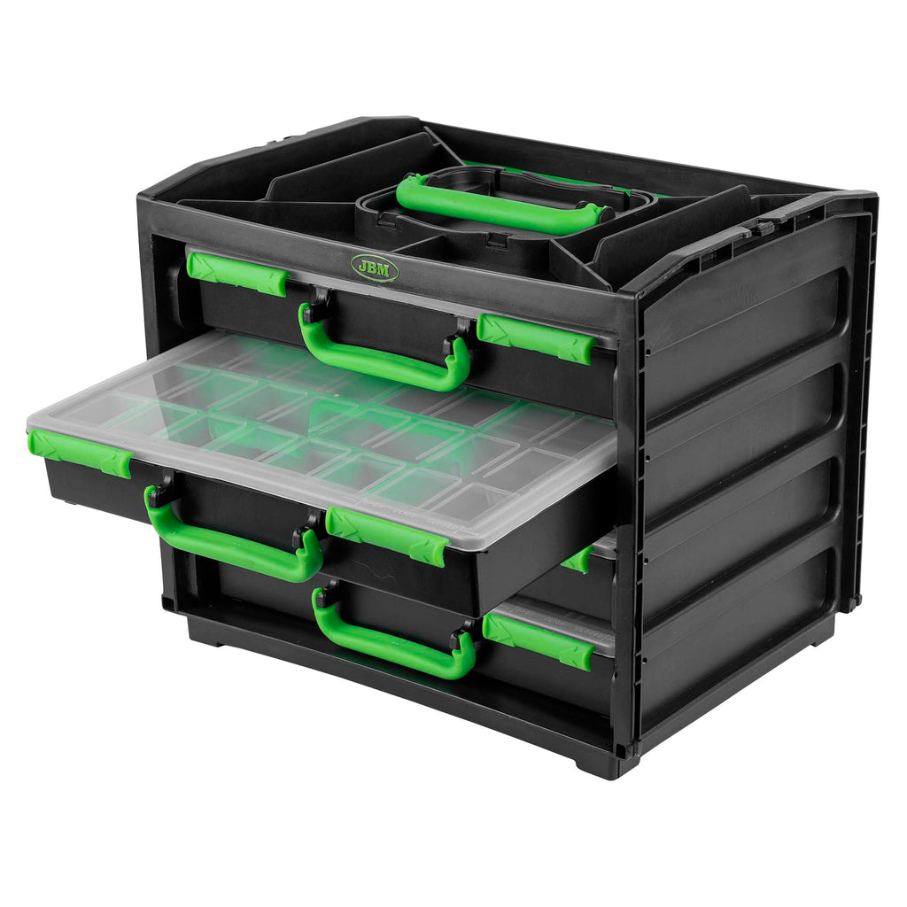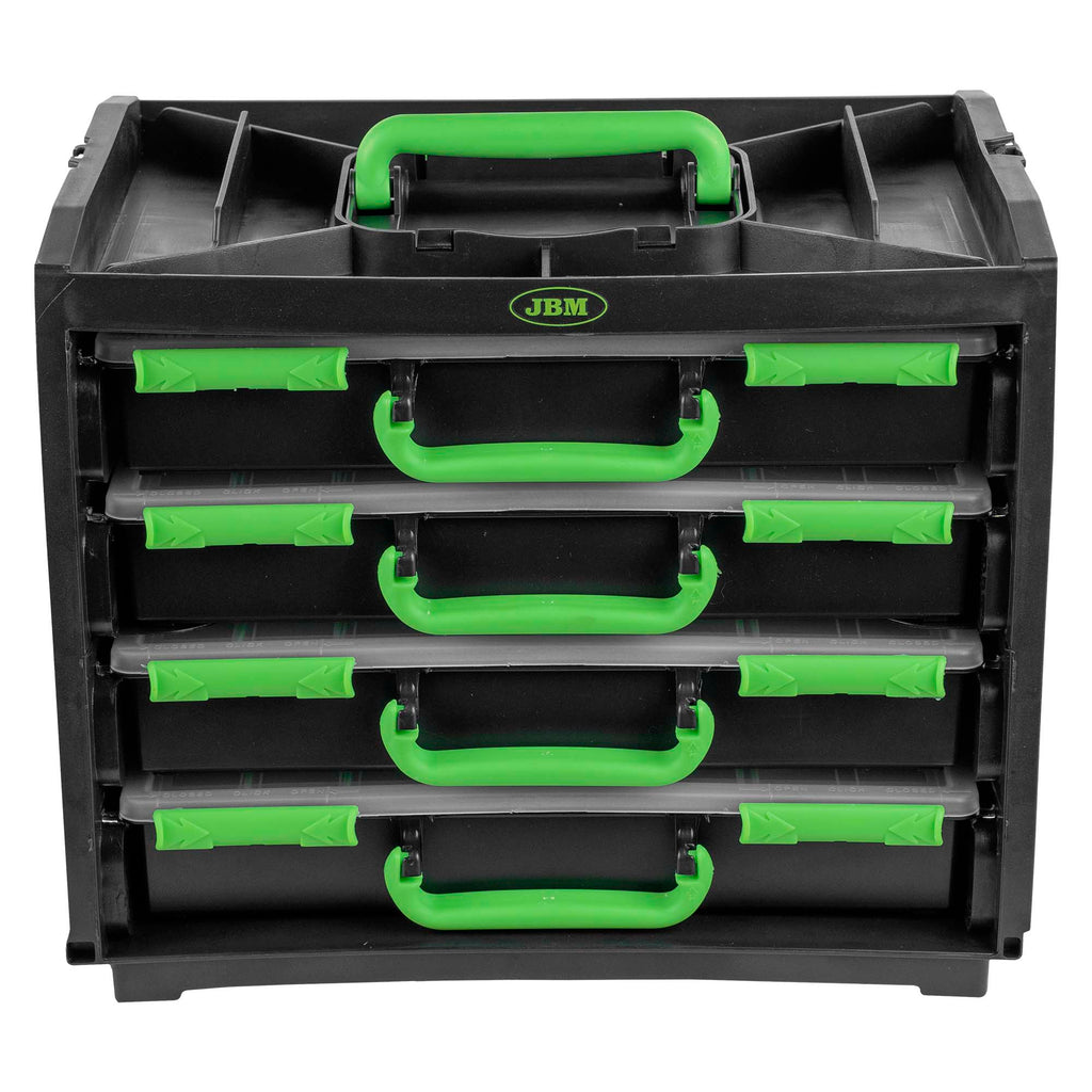 Cassetta organizzatrice pratica e resistente, progettata per riporre, ordinare e trasportare piccoli componenti in modo comodo e sicuro. Include 4 valigette interne estraibili, ciascuna dotata di scomparti per una classificazione efficiente. La struttura compatta con maniglie integrate facilita il trasporto e mantiene tutto perfettamente organizzato sia in officina che in casa.