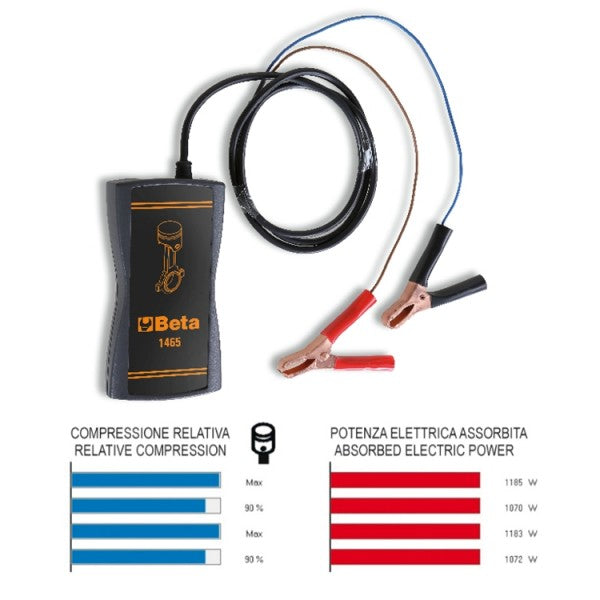 Permette di verificare in pochi secondi la compressione dei motori endotermici senza doversi collegare al motore, prelevando l'alimentazione dalla batteria del veicolo, attraverso un software dedicato