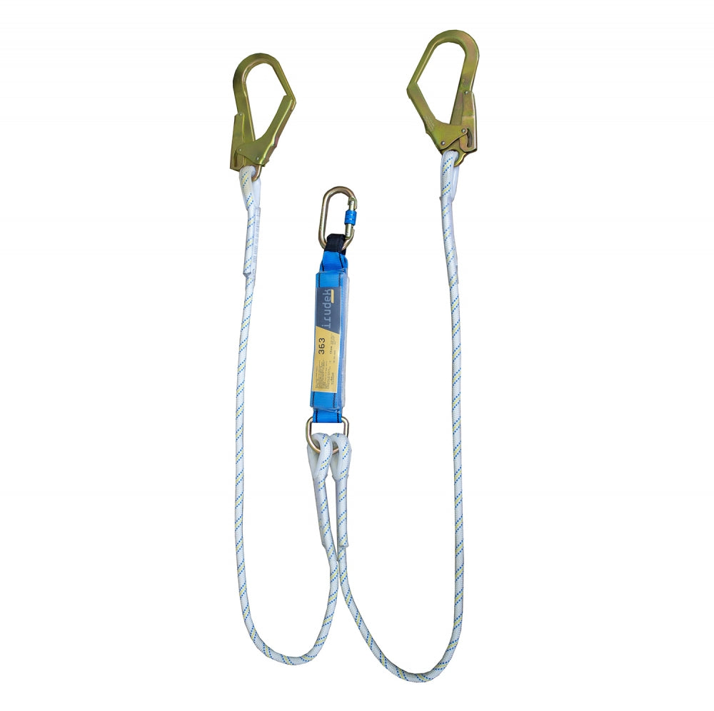 Assorbitore di corda semistatica con biforcazione + 1 moschettone in acciaio con chiusura filettata +2 moschettoni in acciaio con apertura da 50 mm.